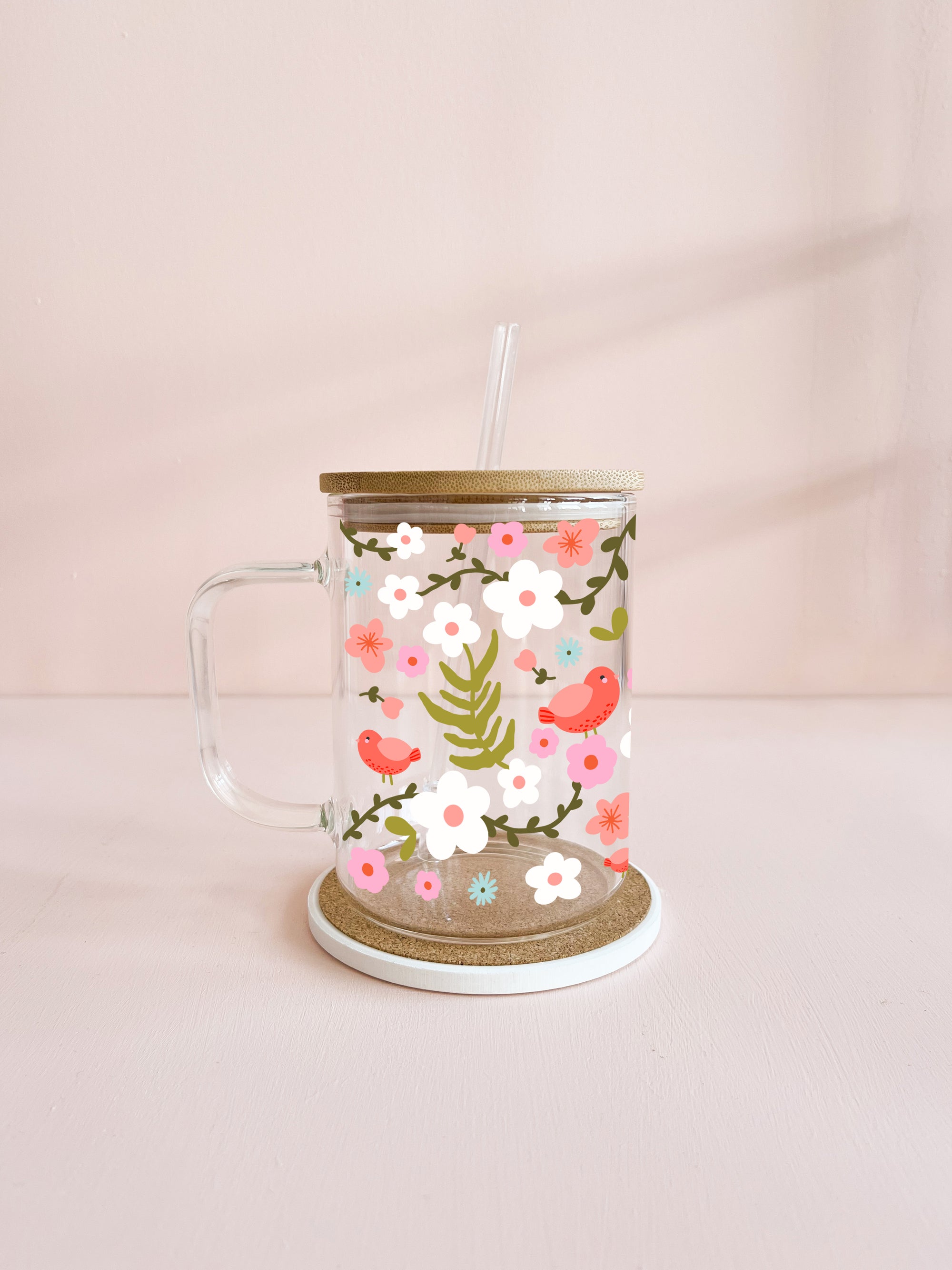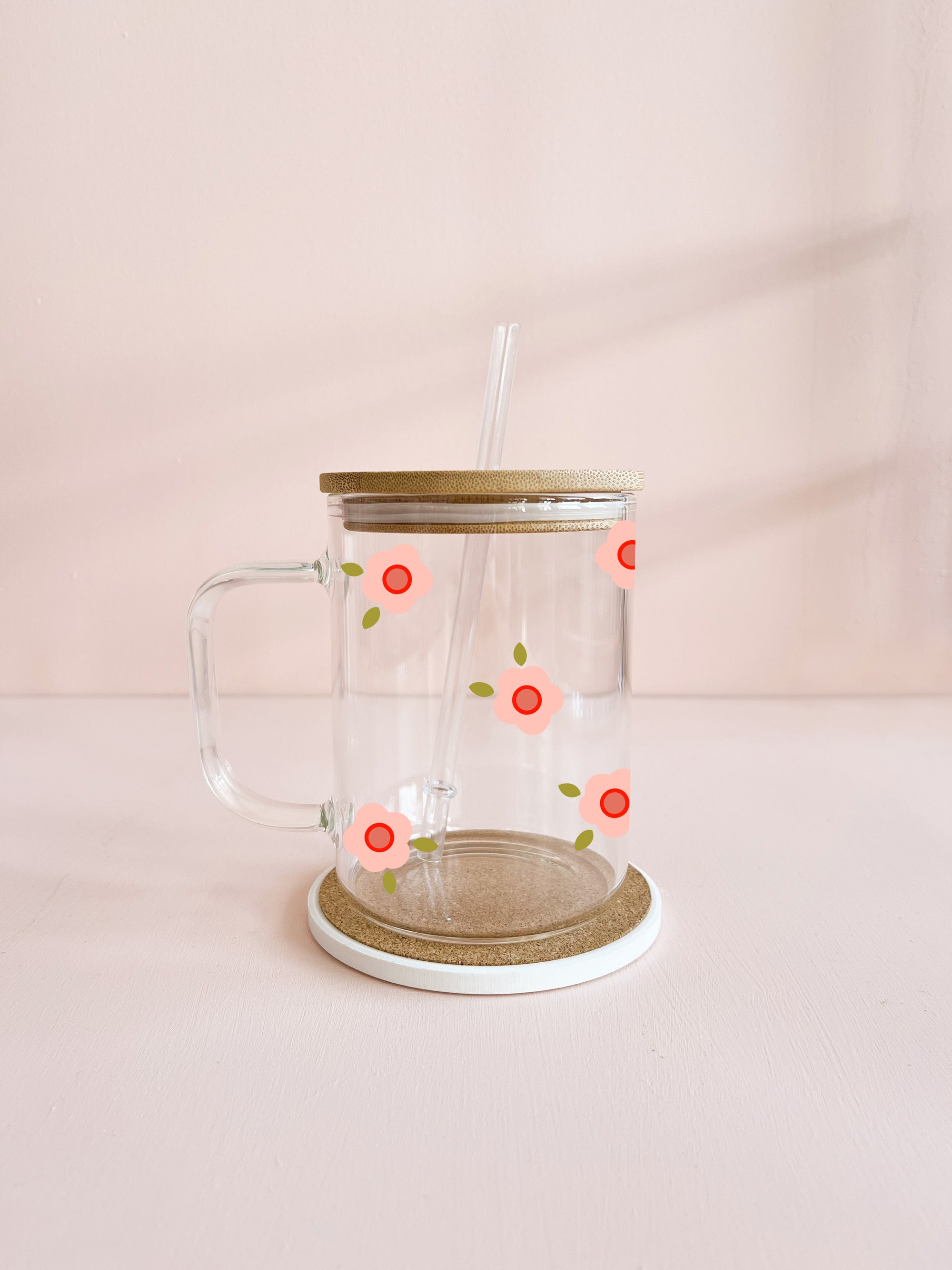 Tasse en verre clair - Fleurs maxi rose